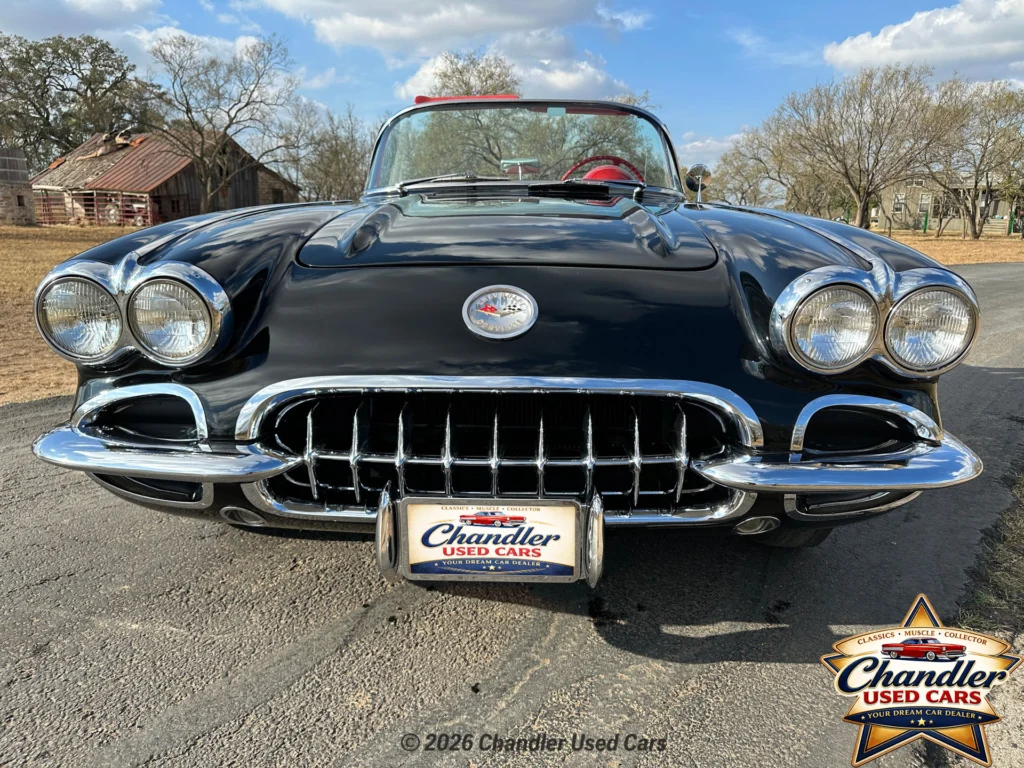 A stunning 1959 Corvette with a 283ci V8, dual 4bbl carbs, 4-speed manual, red interior, and wide whitewall tires. A beautiful and iconic first-generation Corvette.
