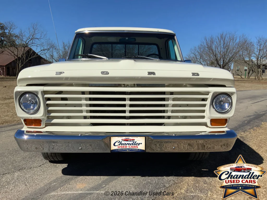A frame-off restored F-100 with a Ford Crown Victoria Police Interceptor drivetrain, 4.6L V8, Vintage Air A/C, power steering, power brakes, and a red spray-in bedliner. A comfortable, reliable, and great-looking classic truck.